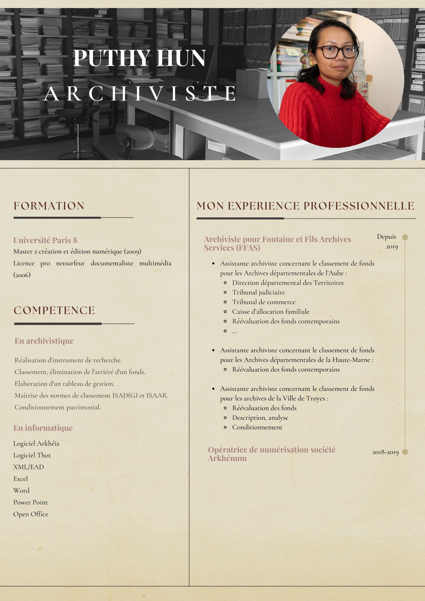 Puthy est employée par FFAS depuis 2020, elle a su nous montrer toute l’étendue de ses qualités et compétences. Puthy est auboise et travaille depuis plusieurs années pour les Archives départementales de l’Aube dans le cadre de marché de numérisation. En effet elle est à la base spécialisée en tant qu’opératrice de numérisation. Diplômée d’un Master 2 création et édition numérique à l’université de Paris 8, nous avons fait sa connaissance il y a de nombreuses années et en 2020 nous lui avons proposé un poste en tant qu’assistante archiviste afin de découvrir une autre facette de monde des archives.